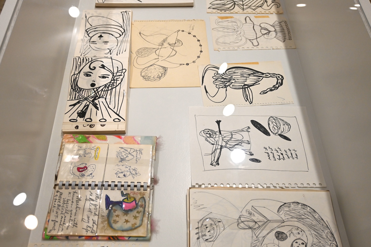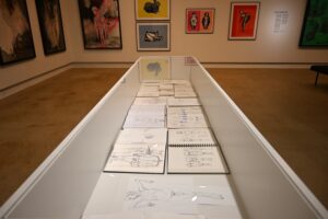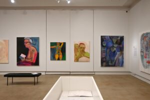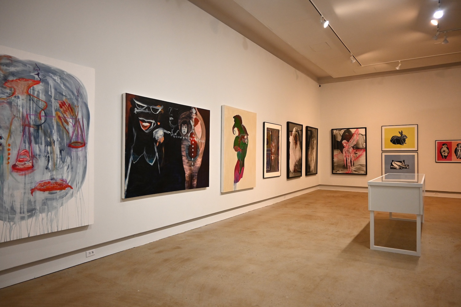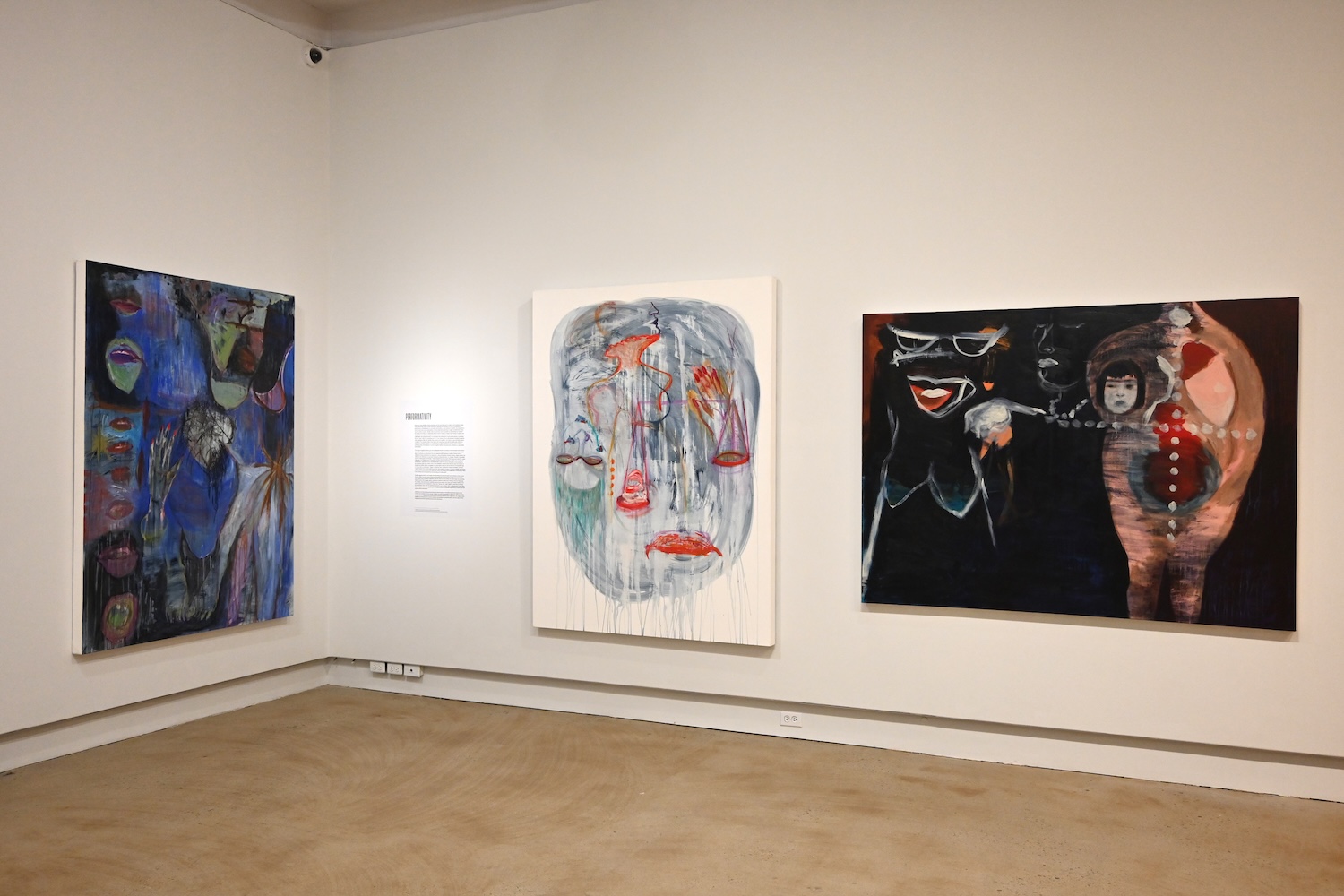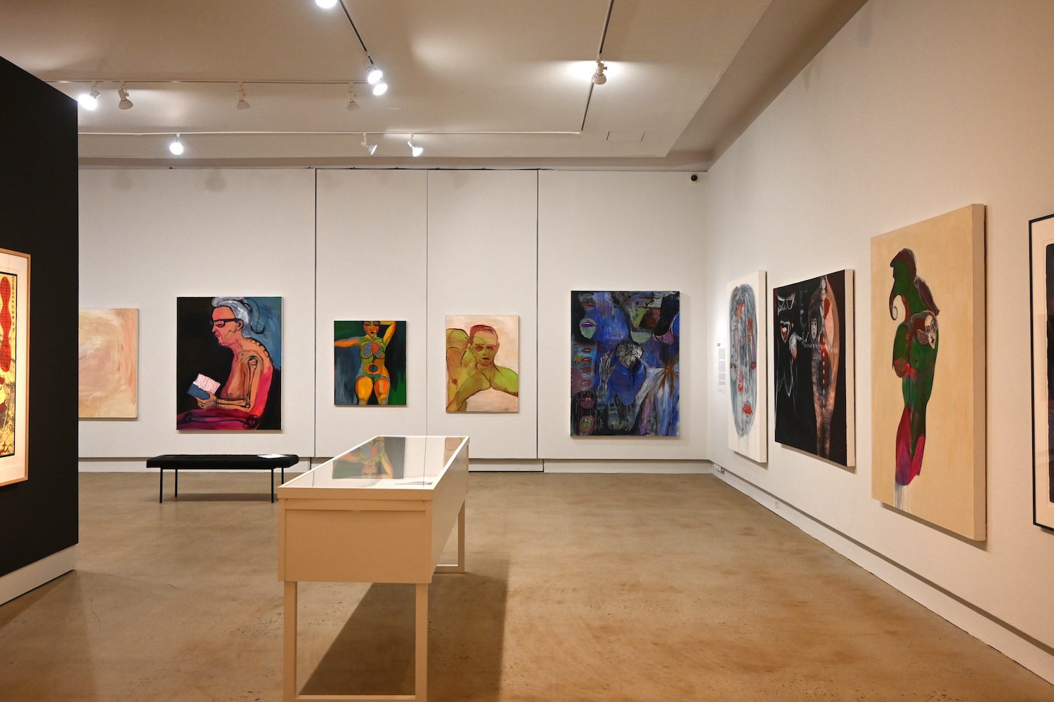 Spanning Streifler’s career, the exhibition is divided into four thematic categories including Memory and Innocence; Fear, Anxiety, Sorrow and Rage; Performativity; and The Carnivalesque. Under the intertwined thematics, the exhibition begins by exploring her early influences of 1980s neo-Expressionism and New York punk and street culture (see To Wonder and Cleo on Stage, both 1987), influences that emerged during her graduate studies at Hunter College in New York. Informed by feminist theory and overlapping discourses on performativity in the literary and visual arts as well as the carnivalesque and the abject, Streifler depicts female figures that appear to defy social conventions, challenging patriarchal notions of feminine beauty, social behavioural norms and traditional gender roles. Her sustained investigation is expressed in emotionally charged paintings on Plexiglas, installations of photographs overlaid with text, and drawings that combine representation and performativity. Streifler’s production is captured in raw, soulful expressions of emotion and experience and more recently—as seen in the exhibition She is Present, 2024—via large-scale drawings and a live performance reflecting directly on the aging female body.